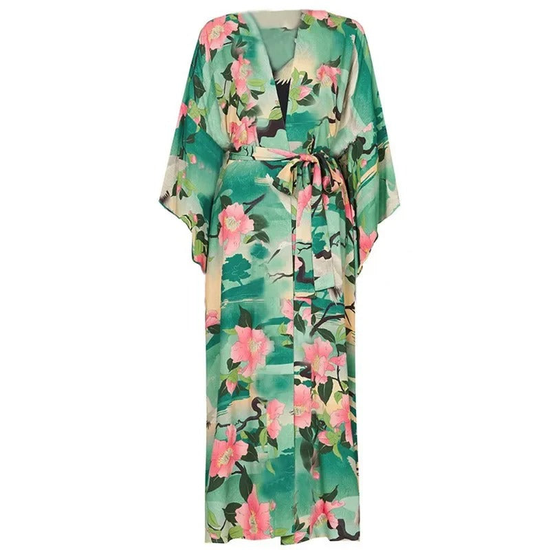 Schlüpfen Sie in den Sommer mit dem Fließenden Grünen Boho Kimono Cover Up und verwandeln Sie sofort Ihren Look! Das traumhafte, floral bedruckte Chiffonmaterial verströmt den unbeschwerten Boho-Charme, den Sie lieben. Perfekt für Pooltage und Strandabende — das ultimative Sommer-Accessoire!