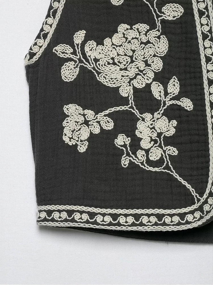 Zeitlose Stickerei trifft auf einen verspielten, kurzen Schnitt – perfekt für moderne Looks mit nostalgischem Touch. Die offene Front sorgt für lässige Leichtigkeit, egal ob beim Stadtbummel oder im Lieblingscafé. Diese Weste ist der Inbegriff von mühelosem Stil – einfach drüberziehen und glänzen.